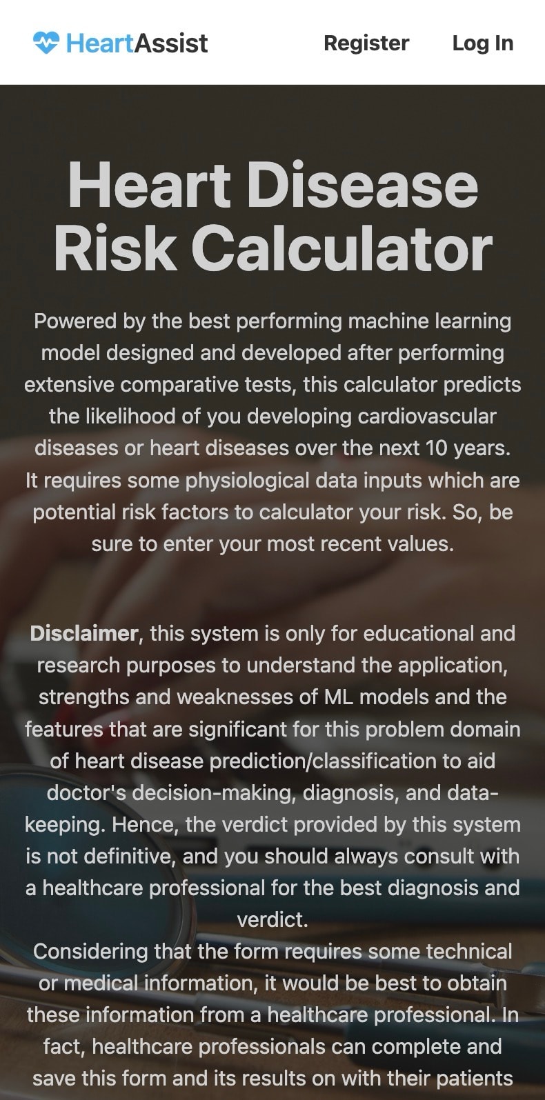 The web application allows users to input their physiological information, potential risk factors, and receive predictions regarding their risk of developing heart or cardiovascular disease. The application includes features such as form saving, submission, user login and registration, and user models for rendering different pages based on account type (patient or doctor). Additionally, it enables users to connect with doctors and fellow patients on the platform.